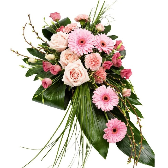 Made with a delightful combination of roses, Gerbera, Lisianthus, Carnations, Pittosporum, Aralia, Aspidistra leaves, Bear Grass, and Cherry Blossom, this spray evokes refinement that will ensure your tribute stands as a memorable symbol of love and respect.