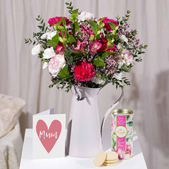 Celebrate mum with this charming Mother’s Day gift set. Featuring a radiant bouquet bursting with pink and white blooms, paired with an A6 ‘Mum’ card and a tube of ‘Special Mum’ shortbread biscuits.